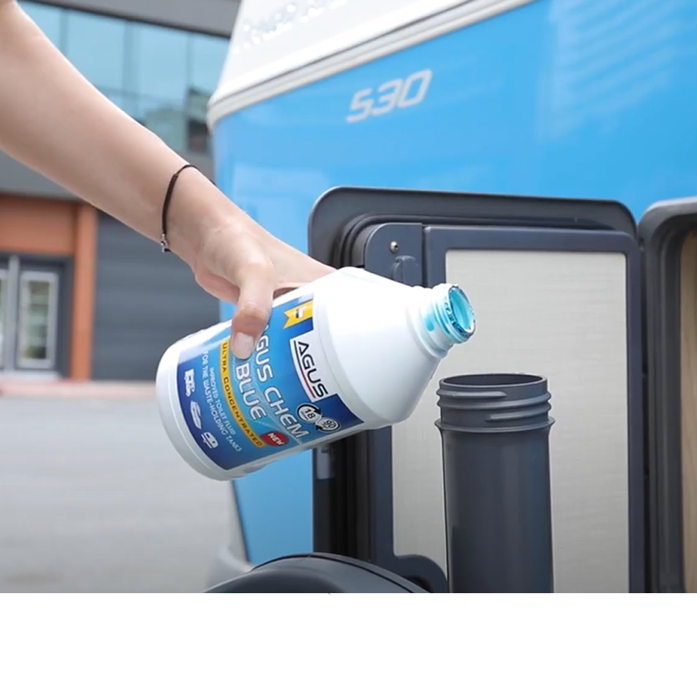 Dozaj Ayarı: Standart 20 litrelik bir atık tankı için yaklaşık 55 ml (şişe üzerindeki ölçeğe göre) Agus Chem Blue yeterlidir.