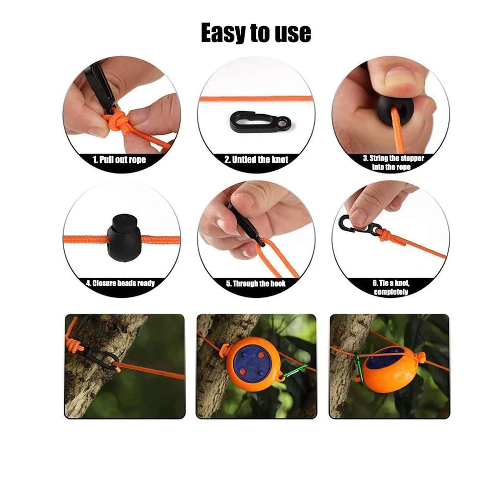 Karabina Avantajı: Metal karabinalar sayesinde düğüm atma zahmetine girmeden; çitlere, dallara veya karavanın güneşlik (tente) ayaklarına hızlıca sabitleme yapabilirsiniz.