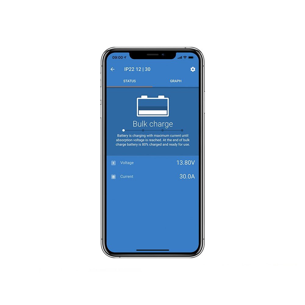 Dahili Bluetooth (Smart): Şarj sürecini VictronConnect uygulaması üzerinden telefonunuzdan izlemenize olanak tanır. Voltaj, akım ve şarj döngüsü geçmişini görebilir, ayarları saniyeler içinde güncelleyebilirsiniz.